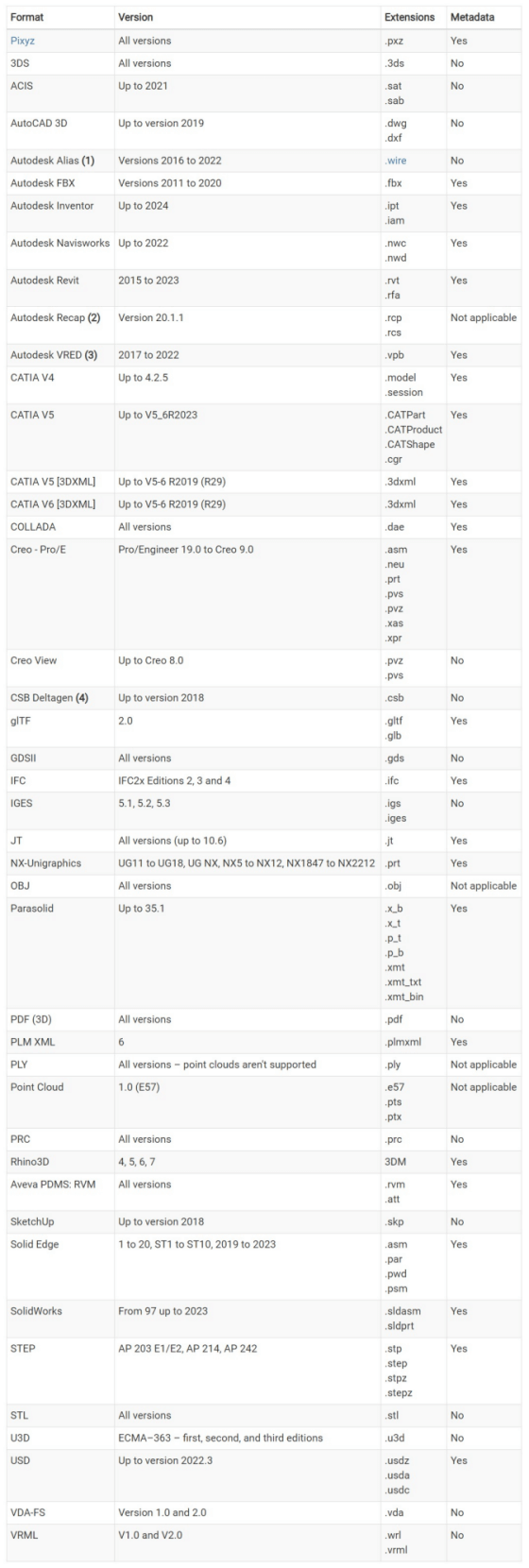 完成激活后,就可以使用Pixyz插件导入各种类型的数据了,我们以Pixyz插件2.x版本支持的工业模型格式如下: